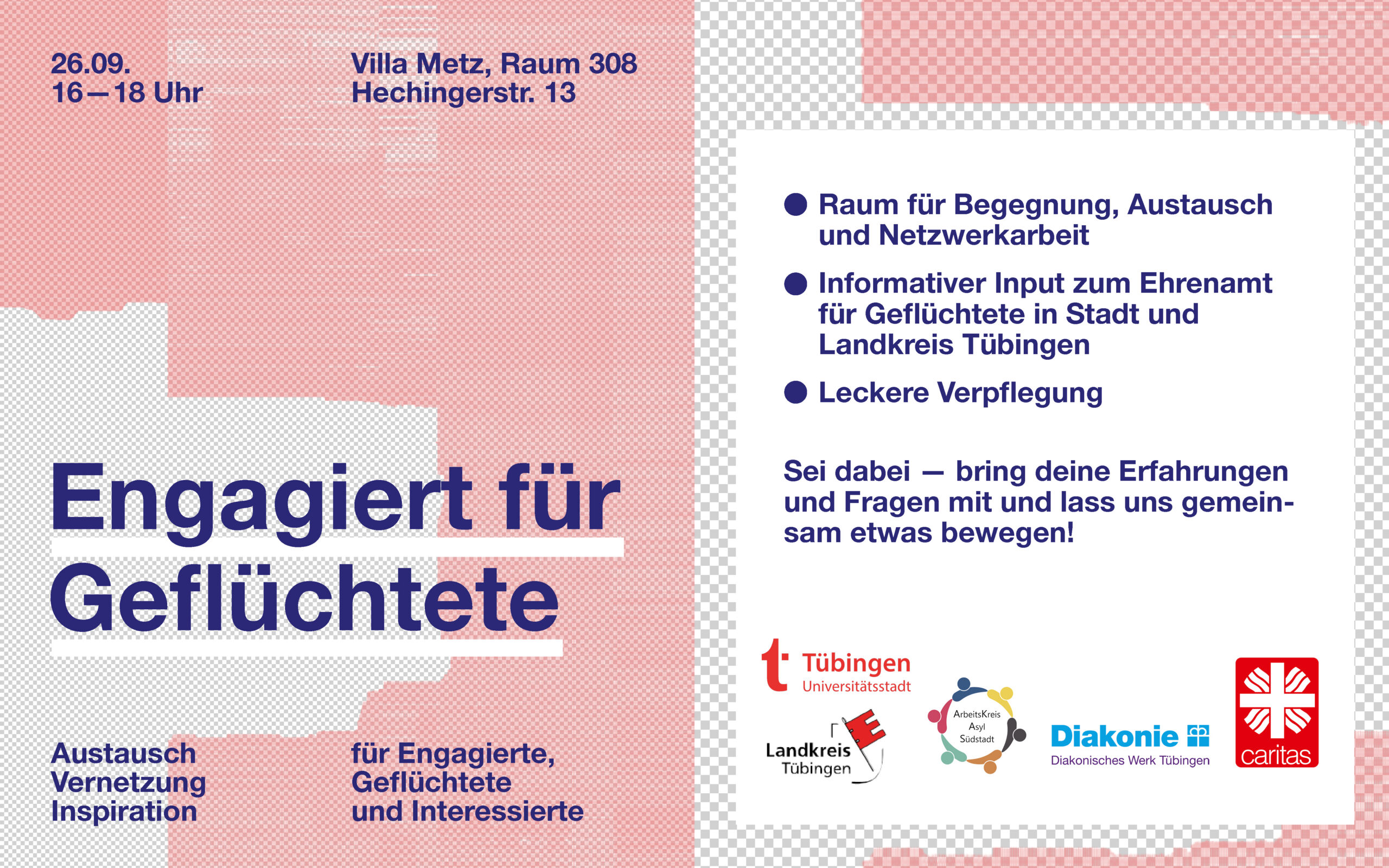 Bei der Veranstaltung wollen wir gemeinsam den aktuellen Stand des Engagements für geflüchtete Menschen in Tübingen betrachten, Herausforderungen diskutieren und nach Wegen suchen, um Unterstützung effektiver und nachhaltiger zu gestalten