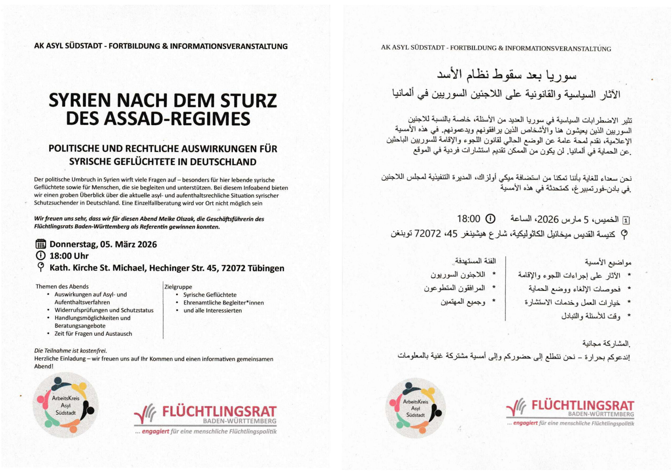 Als Referentin begrüßen wir Meike Olszak, Geschäftsführerin des Flüchtlingsrats Baden-Württemberg, die die Entwicklungen einordnet und praxisnah erläutert, welche Auswirkungen auf Asylverfahren, Schutzstatus und mögliche Widerrufsprüfungen zu erwarten sind. Darüber hinaus werden Handlungsmöglichkeiten sowie bestehende Beratungsangebote vorgestellt.